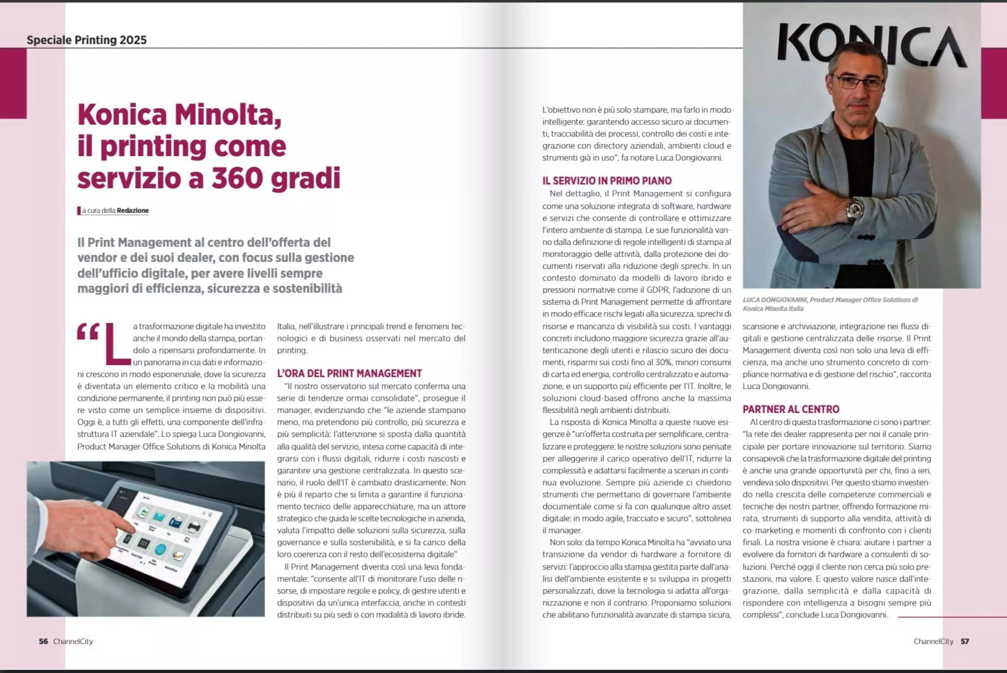 Non solo: da tempo Konica Minolta ha “avviato una transizione da vendor di hardware a fornitore di servizi: l’approccio alla stampa gestita parte dall’analisi dell’ambiente esistente e si sviluppa in progetti personalizzati, dove la tecnologia si adatta all’organizzazione e non il contrario. Le nostre soluzioni abilitano funzionalità avanzate di stampa sicura, scansione e archiviazione, integrazione nei flussi digitali e gestione centralizzata delle risorse. Il Print Management diventa così non solo una leva di efficienza, ma anche uno strumento concreto di compliance normativa e di gestione del rischio”, racconta Luca Dongiovanni.